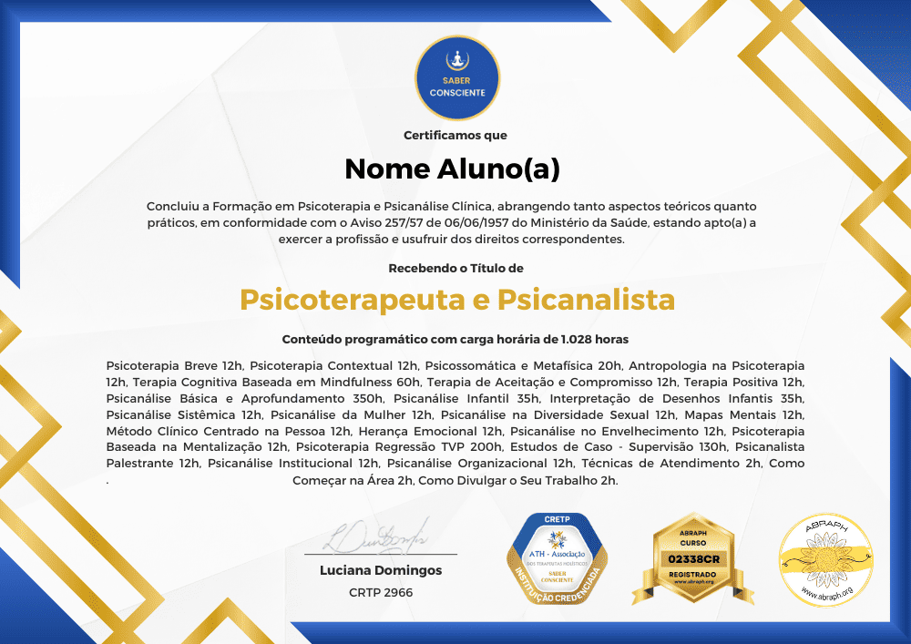 Garanta uma carreira promissora como Psicoterapeuta e Psicanalista e, ao concluir o curso, receba seu Certificado Profissional de 1.028 horas válido para exercer a profissão legalmente. Reconhecido pela ABRAPH – Academia Brasileira de Psicoterapia Holística e pela Associação dos Terapeutas ATH.