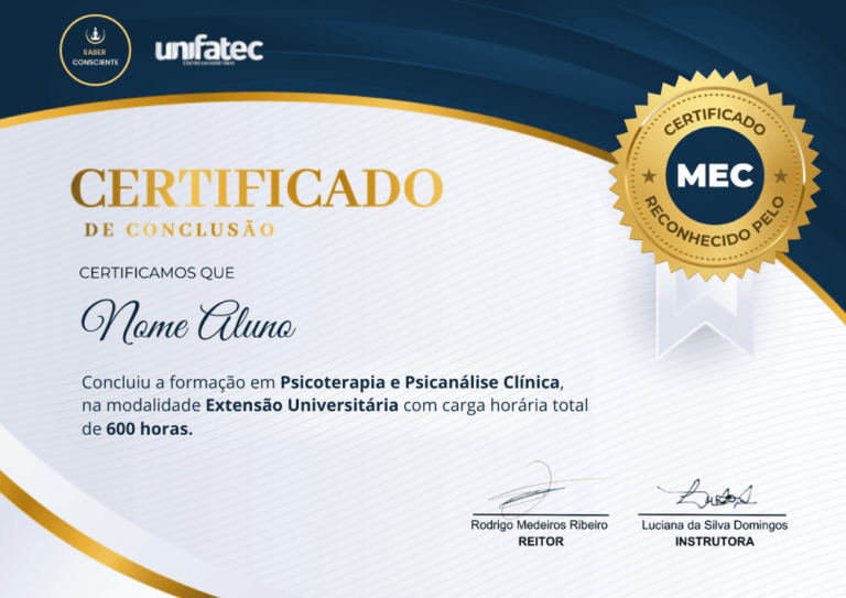Ao concluir o curso e atingir pelo menos nota 60 nas avaliações, você receberá 2 (dois) certificados como Psicoterapeuta e Psicanalista, com todas as técnicas descritas. É necessário concluir 100% do curso para solicitar os certificados.